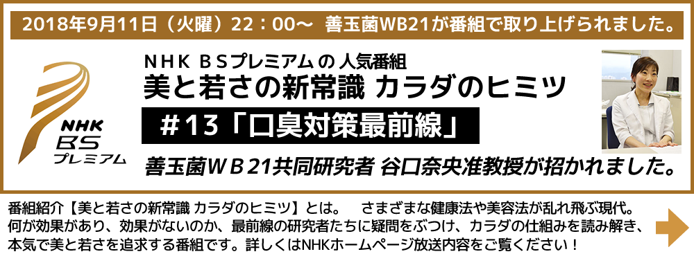 当院は、患者さんのご協力のもと、研究活動も行なっています。善玉菌「WB21乳酸菌」と口臭、歯周病菌に関しては、福岡歯科大学、九州大学、わかもと製薬(株)と、善玉菌「WB21乳酸菌」 と虫歯菌に関しては、北海道医療大学、わかもと製薬(株)と共同研究を行なっています。